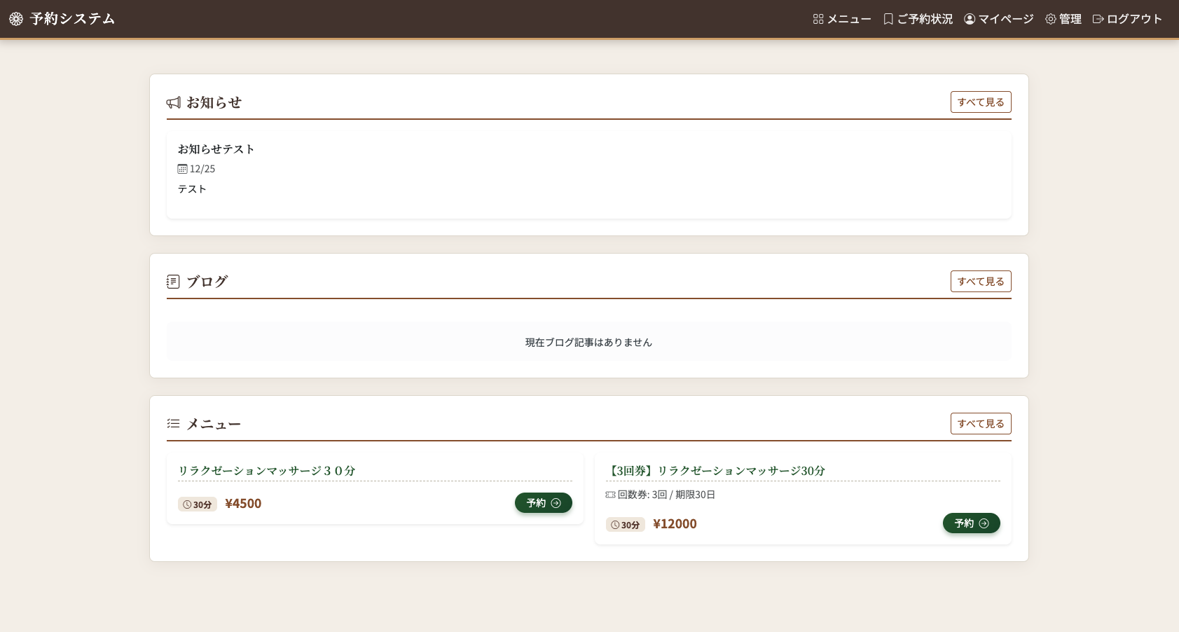 全てのプランに共通の設定項目は以上です。次に顧客側の予約システム画面を確認します。